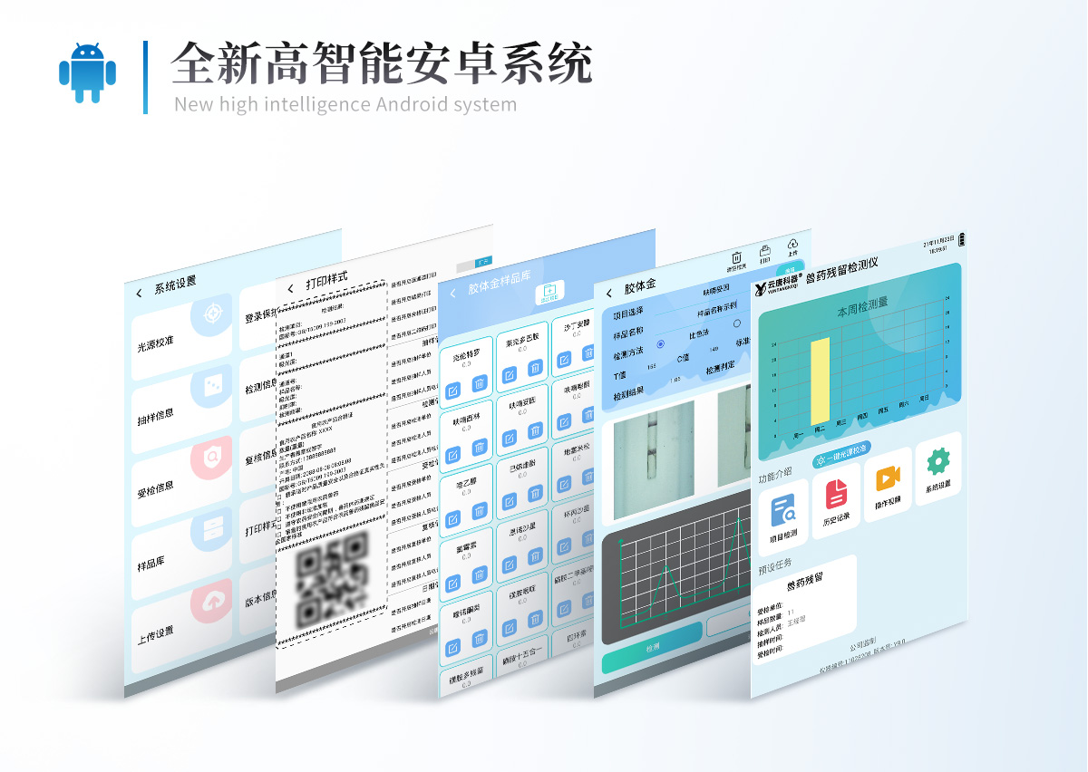 | 儀器采用10.1英寸液晶觸摸屏顯,搭配運行安卓智能操作系統,主控芯片采用ARM Cortex-A7,RK3288/4核處理器,主頻1.88Ghz,運轉速度更快速,性能更強。 | 儀器功能包括:膠體金檢測模塊、數字化管理模塊、無線通訊模塊等,可以滿足同一軟件下實現所有檢測項目的檢測,并在同一窗口展示檢測結果。 | 一體化便攜式快檢設備,采用交直流兩用供電方式,可連接車載電源,配備6ah大容量充電鋰電池,可以滿足現場及流動檢測使用的需求。儀器尺寸:43×35×20cm, 主機凈重:5.1kg | 系統自帶數據集成模塊,設備首頁自動統計檢測數據包含:周檢測數據、月檢測數據,全部檢測總數量,均包含檢測總數,合格數,不合格數,以及相關柱形分析圖,對各項檢測數據清晰掌握,無需電腦查詢,更加快捷直觀。 | 儀器具有任務預設模塊,可在樣品送檢前提前預設樣品名稱、檢測指標、送檢單位等信息,樣品送檢時一鍵調取保存信息,檢測更加方便快捷。 | 軌道式自動傳輸掃描方式,可實時顯示金標卡實時圖像,系統自動分析并呈現出CT曲線圖,CT線自動識別,無需手動調整,完成檢測后自動退出檢測卡。 | 結果判定線可修改,對照值標定值可保存,斷電不丟失數據。 | 兼容市場上其他膠體金卡,使用耗材不受限制,極大增強用戶使用體驗。 | 儀器檢測系統擁有龐大數據庫,并且構建了完善的檢索、修訂功能。食品庫涵蓋多種樣品名稱,可按需添加或刪除、編輯樣品名稱;產品數據庫以及歷史檢測記錄支持一鍵檢索功能。 | 系統打印自定義化,打印格式多樣化,產品合格證(****要求),二維碼,抽樣信息、檢測信息,受檢信息、復核信息、抽樣日期、檢測日期等信息結果,可按需求自行設置打印內容。 | A4紙版本報告打印功能(可選配):設備擁有兩種結果展示方式,可以自動生成A4打印模板和小票打印模板兩種樣式,可通過WiFi及網線等方式鏈接外置打印機可進行打印 | 儀器具有 wifi 聯網上傳、RJ45網線連接功能,可以快速上傳數據。同步對接監管平臺,數據可局域網和互聯網數據上傳,檢測結果直接傳至食品安全監管平臺。進行區域食品安全監管及大數據分析處理與數據統計,檢測區域食品安全長短期動態,達到食品安全問題預估、預警。 | 設備支持U盤存儲,標準USB接口,免驅動安裝。檢測結果存儲容量20萬條以上,可生成Excel表格,進行一鍵拷貝,并具有登錄保護功能,可設置用戶名及密碼,規范不同人員操作權限,防止非工作人員操作,并且可以進行重新校準、鎖定、恢復出廠設置功能。儀器固件可升級,后期檢測項目可擴充。 | 儀器具備遠程升級功能,可定向分客戶分儀器更新,開機后自動更新,并可持續性免費更新系統版本,無需像傳統產品返廠更新,節省時間及人力成本并避免了物流運輸返廠升級導致設備損壞的潛在風險。 |