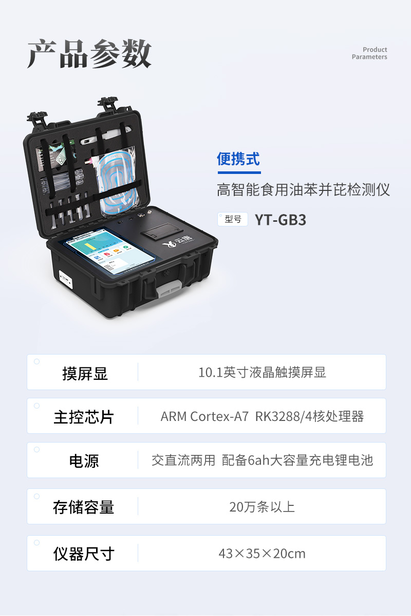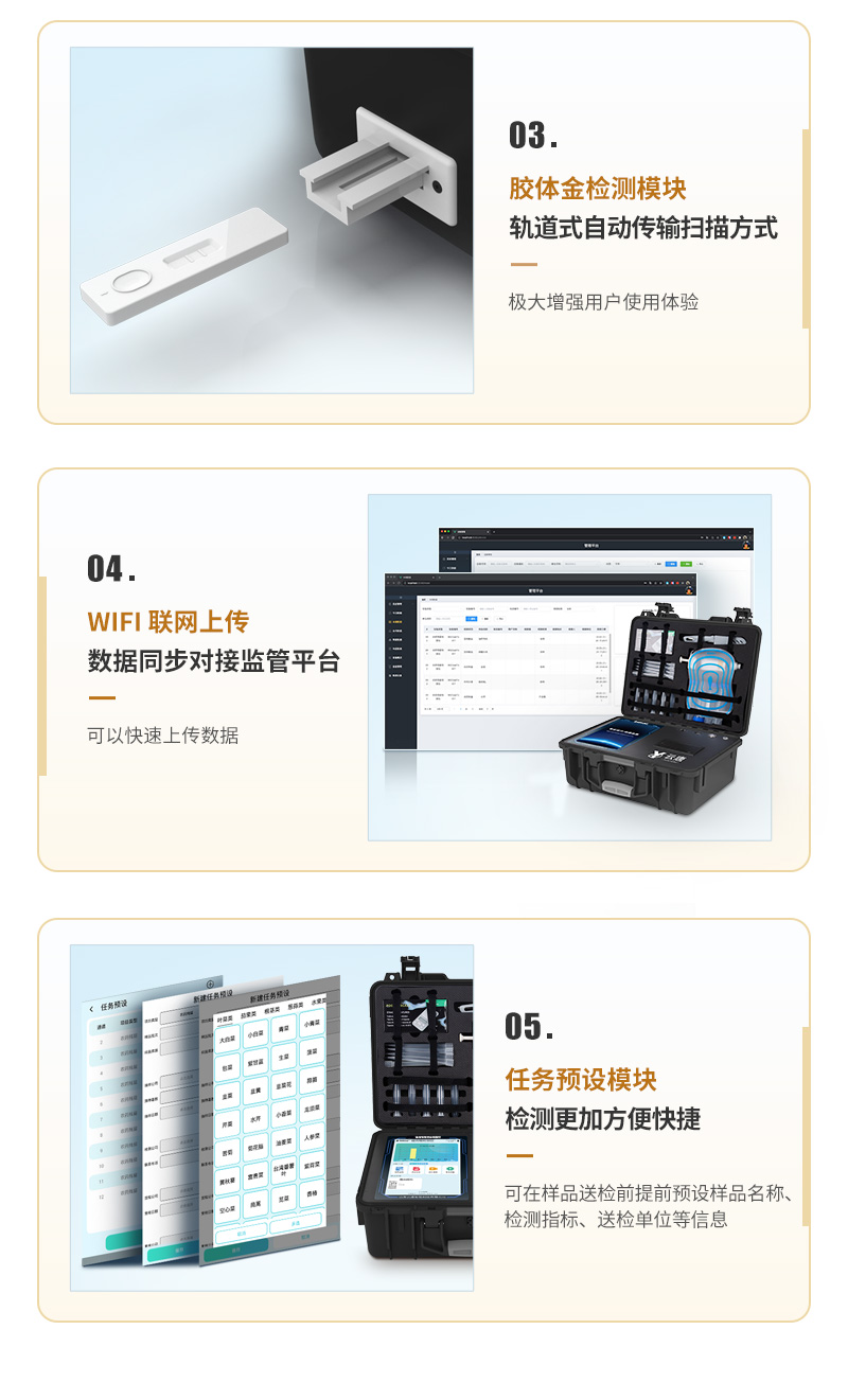 | 儀器采用10.1英寸液晶觸摸屏顯,搭配運行安卓智能操作系統,主控芯片采用ARM Cortex-A7,RK3288/4核處理器,主頻1.88Ghz,運轉速度更快速,性能更強。 | 儀器功能包括:膠體金檢測模塊、數字化管理模塊、無線通訊模塊等,可以滿足同一軟件下實現所有檢測項目的檢測,并在同一窗口展示檢測結果。 | 一體化便攜式快檢設備,采用交直流兩用供電方式,可連接車載電源,配備6ah大容量充電鋰電池,可以滿足現場及流動檢測使用的需求。儀器尺寸:43×35×20cm, 主機凈重:5.1kg | ★系統自帶數據集成模塊,設備首頁自動統計檢測數據包含:周檢測數據、月檢測數據,全部檢測總數量,均包含檢測總數,合格數,不合格數,以及相關柱形分析圖,對各項檢測數據清晰掌握,無需電腦查詢,更加快捷直觀。 | 軌道式自動傳輸掃描方式,可實時顯示金標卡實時圖像,系統自動分析并呈現出CT曲線圖,CT線自動識別,無需手動調整,完成檢測后自動退出檢測卡。 | 結果判定線可修改,對照值標定值可保存,斷電不丟失數據。 | 兼容市場上其他膠體金卡,使用耗材不受限制,極大增強用戶使用體驗。 | 儀器檢測系統擁有龐大數據庫,并且構建了完善的檢索、修訂功能。 | 食品庫涵蓋多種樣品名稱,可按需添加或刪除、編輯樣品名稱; | 產品數據庫以及歷史檢測記錄支持一鍵檢索功能。 | 系統打印自定義化,打印格式多樣化,產品合格證(****要求),二維碼,抽樣信息、檢測信息,受檢信息、復核信息、抽樣日期、檢測日期等信息結果,可按需求自行設置打印內容。 | 內置限量規判程序:具有限量查詢、添加物質合規判定系統。檢測出結果后,系統自動調用系統數據庫中相關國標進行比對判定,客觀顯示判定結果是否合格,檢測對象是否允許添加該物質,若允許添加則能準確獲得食品中添加該物質的限量及添加依據的****。 | 儀器具有 wifi 聯網上傳、RJ45網線連接功能,可以快速上傳數據。同步對接監管平臺,數據可局域網和互聯網數據上傳,檢測結果直接傳至食品安全監管平臺。進行區域食品安全監管及大數據分析處理與數據統計,檢測區域食品安全長短期動態,達到食品安全問題預估、預警。 | 設備支持U盤存儲,標準USB接口,免驅動安裝。檢測結果存儲容量20萬條以上,可生成Excel表格,進行一鍵拷貝,并具有登錄保護功能,可設置用戶名及密碼,規范不同人員操作權限,防止非工作人員操作,并且可以進行重新校準、鎖定、恢復出廠設置功能。儀器固件可升級,后期檢測項目可擴充。 | 儀器加入遠程升級功能,可定向分客戶分儀器更新,開機后自動更新,客戶無需任何操作,即可升級全新項目。做到了無需退換機器即可實現實時遠程升級檢測儀器。 | 可連接外部打印機,打印A4紙規格的檢測報告(可選配) |
