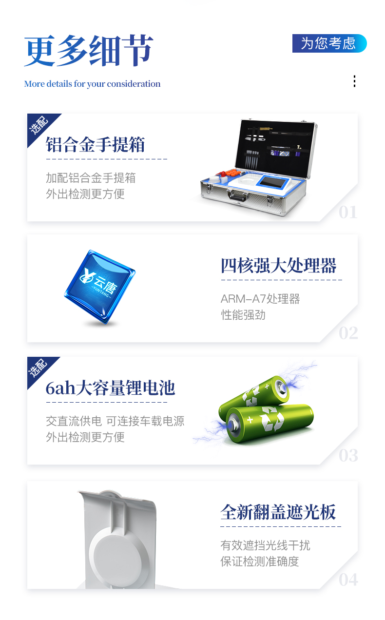 | 主控芯片采用ARM Cortex-A7,RK3288/4核處理器,主頻1.88Ghz,運轉速度更快速,穩(wěn)定性更強。 | 顯示方式:7英寸液晶觸摸屏顯示,人性化中文操作界面,讀數(shù)直觀、簡單。 | 直流12V供電,可連接車載電源,可配6ah大容量充電鋰電池,方便戶外流動測試。 | 雙波長冷光源,每個通道均配置405、528nm波長光源,標配**的光路切換裝置,專利光路切換功能可實現(xiàn)*多64波長,并且所有檢測項目可實現(xiàn)所有通道同時檢測。 | 光源亮度自動調節(jié)與校準 | 智能恒流穩(wěn)壓,光強自動校準,長時間連續(xù)工作光源無溫漂現(xiàn)象。 | 內(nèi)置新國家限量標準,與所測結果進行現(xiàn)場比對,并持續(xù)更新標準。 | 不間斷進樣,連續(xù)檢測 | 樣本編號自動累加 | 檢測項目可擴充。 | 檢測結果可批量打印,批量上傳。 | 檢測結果為Excel表格,連接電腦即可拷貝。 | 支持U盤存儲,標準USB接口,免驅動安裝。 | 可配置大容量鋰電池,固件可升級 |