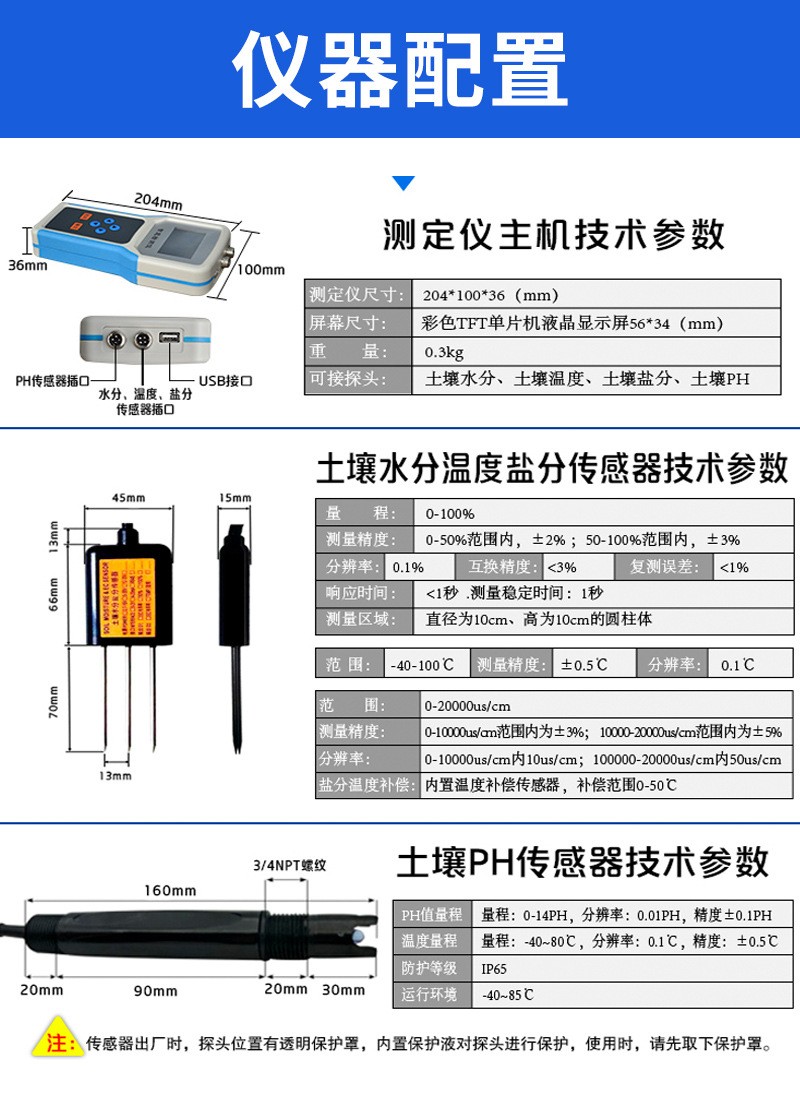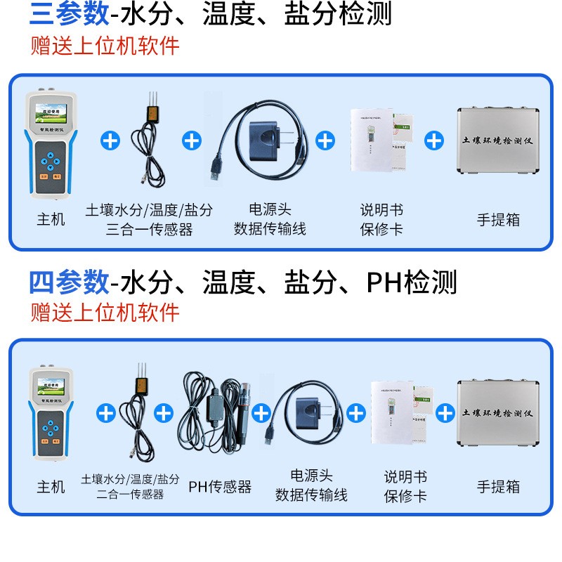 | 儀器可加配4G聯網功能和數據管理平臺,將本機存儲的歷史數據無線上傳到智慧云農業平臺,方便用戶進行數據管理和長期分析。 | 可選擇記錄模式:手動記錄、自動記錄,自動記錄可設置記錄時間間隔。 | 采用一體化結構設計,集液晶顯示儀表+傳感器+便攜手提箱合成在一個便攜式手提箱內,本機體積小巧,操作簡單,性能可靠,野外攜帶極為方便。 | 大屏幕中文液晶顯示,可實時顯示溫度值、水分值、組數、低電壓示警,存儲數據等,便于野外攜帶作業。 | 儀表可設置多種土質配方,便于不同土質的水分測量。 | 能存儲指定各個點的土壤溫度值、水分值,上位機軟件功能強大,隨時可以通過USB接口將記錄中的數據導出到計算機上,并可以存儲為EXCE表格文件,生成數據曲線,以供其它分析軟件進一步進行數據處理。 |
