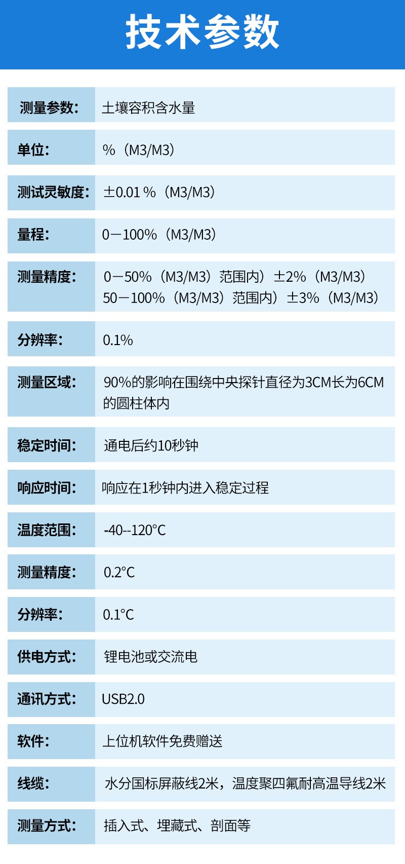 | 測量參數:土壤容積含水量; | 單位:%(m3/m3); | 測試靈敏度:±0.01 %(m3/m3); | 量程:0-100%(m3/m3); | 測量精度:0-50%(m3/m3)范圍內)±2%(m3/m3);50-100%(m3/m3)范圍內)±3%(m3/m3); | 分辨率:0.1% | 測量區域:90%的影響在圍繞中央探針直徑為3cm長為6cm的圓柱體內; | 穩定時間:通電后約10秒鐘; | 響應時間:響應在1秒鐘內進入穩定過程; | 供電方式:鋰電池或交流電 | 通訊方式:USB2.0 | 軟件: 上位機軟件免費贈送 | 線纜: 水分國標屏蔽線2米,溫度聚四氟耐高溫導線2米。 | 測量方式:插入式、埋藏式、剖面等 |