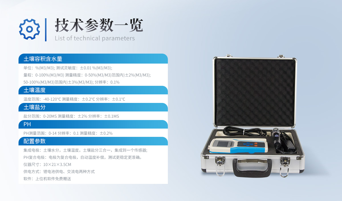 | 測量參數:土壤容積含水量; 單位:%(m3/m3); 測試靈敏度:±0.01 %(m3/m3); | 量程:0-100%(m3/m3) 測量精度:0-50%(m3/m3)范圍內)±2%(m3/m3); | 50-100%(m3/m3)范圍內)±3%(m3/m3); 分辨率:0.1% | 土壤溫度范圍:-40-120℃ 測量精度:±0.2℃ 分辨率:±0.1℃ | 土壤鹽分范圍:0-20ms 測量精度:±2% 分辨率:±0.1ms | PH測量范圍:0-14 分辨率:0.1 測量精度:±0.2% | 集成電極:土壤水分,土壤溫度,土壤鹽分三合一,集成到一個傳感器; | ph復合電極:電極為復合電極,自動溫度補償,測試更穩定更準確。 | 儀器尺寸:10×21×3.5cm | 供電方式:鋰電池供電、交流電兩種方式 | 軟件:上位機軟件免費贈送 |