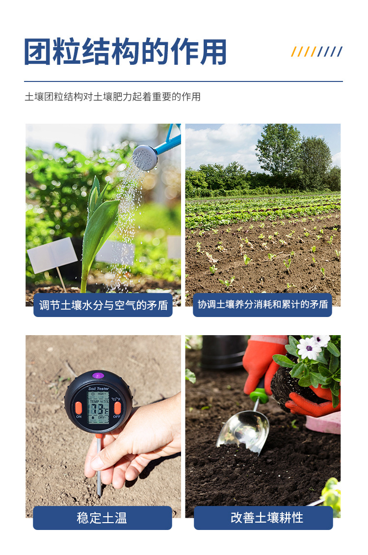 土壤團(tuán)粒結(jié)構(gòu)對土壤肥力起著重要的作用。良好的團(tuán)粒結(jié)構(gòu)一般應(yīng)具備三方面的性質(zhì):具有一定的大小,過大或過小都對形成適當(dāng)空隙比例不利:具有多級空隙,大空隙可通氣透水,小空隙保水保肥;具有一定的穩(wěn)定性,即水穩(wěn)性、機(jī)械穩(wěn)性和生物學(xué)穩(wěn)定性。良好的團(tuán)粒結(jié)構(gòu)性肥力的基礎(chǔ),團(tuán)粒結(jié)構(gòu)與土壤土壤肥力的關(guān)系主要表現(xiàn)在以下幾個方面:調(diào)節(jié)土壤水分與空氣的矛盾;協(xié)調(diào)土壤養(yǎng)分的消耗和積累的矛盾;穩(wěn)定土溫;改善土壤耕性,有利于作物根系伸展。