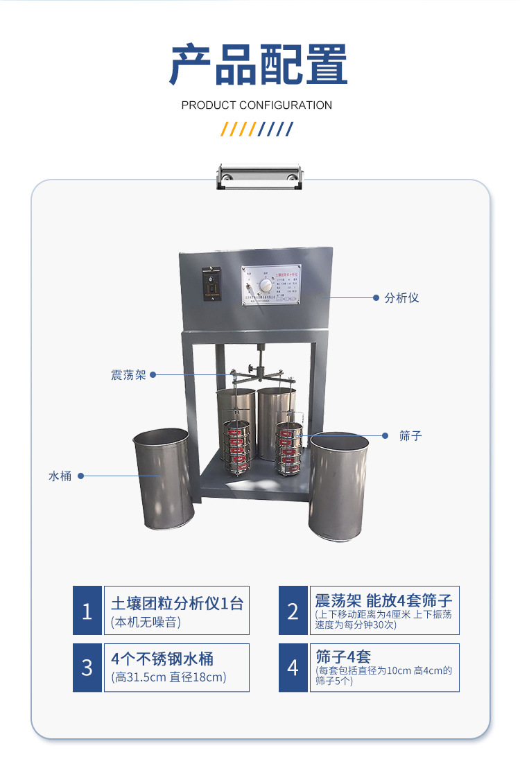 | 團(tuán)聚體分析儀一臺(本機(jī)無噪音) | 1)震蕩架,能放四套篩子,上下移動距離為4厘米,上下振蕩速度為每分鐘30次。 | 2)水桶四個,高31.5厘米,直徑18厘米,用不銹鋼制成。 | 3)篩子四套,每套包括直徑為10厘米,高4厘米的篩子5個,(5.0mm、2.0mm、1.0mm、0.5mm、0.25mm)、 | 注.5.0mm的篩子根據(jù)用戶的需求可調(diào)換成0.106mm的篩子) |