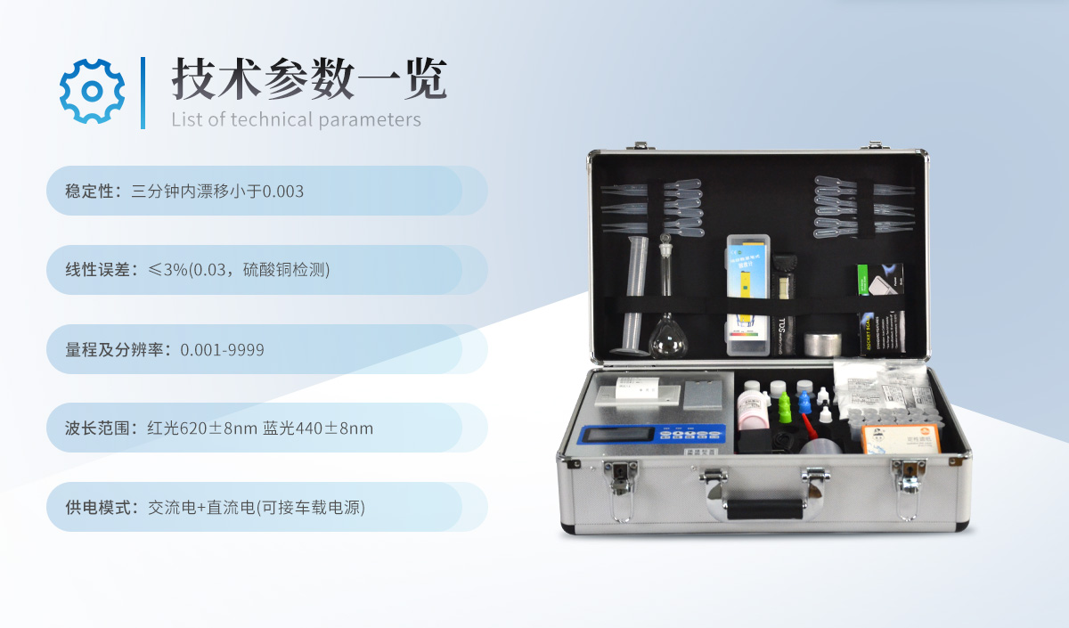 | 1.電源:交直流兩用,交流電:180V~240V、50赫茲;直流電:5V~12V(內置鋰電池) | 2.量程及分辨率:0.001-9999 | 3.穩(wěn)定性:三分鐘內漂移小于0.003 | 4.線性誤差:≤3%(0.03,硫酸銅檢測) | 5.重復性誤差:≤0.5%(0.005,重鉻酸鉀溶液) | 6.靈敏度:紅光≥4.5 ×10-5 藍光≥3.17×10-3 | 7.波長范圍:紅光620±8nm 藍光440±8nm | 8.土壤水分技術參數水分單位:%(g/100g)含水率測試范圍:0-100% 精度:±0.5% | 9.土壤中速效N、P、K三種養(yǎng)分一次性同時浸提測定、科學指導施肥 | 10.肥料中氮(N)、磷(P)、鉀(K)等養(yǎng)分同時、快速、準確檢測 | 11.測試速度:測一個土樣(N、P、K)≤30分鐘(含前處理時間) | 12.可同時檢測8個土樣≤1個小時(含前處理時間) | 13.數據打印:內置一鍵式熱敏打印機(國內率先專利設計) | 14.儀器尺寸:492*305*165mm |