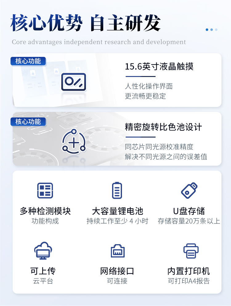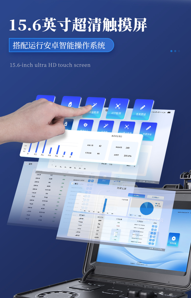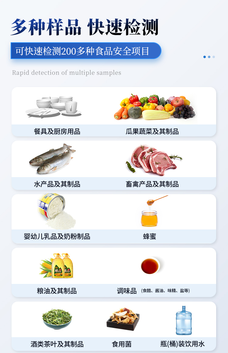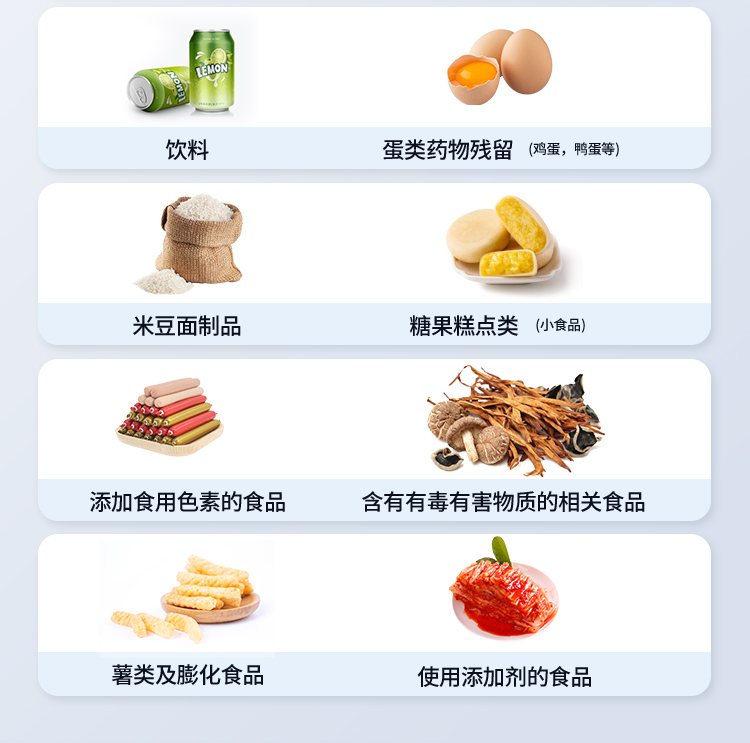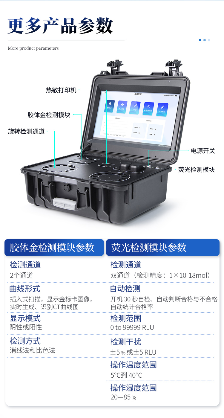 1. 功能構成:主要包括分光光度模塊、新型農殘檢測模塊、膠體金檢測模塊、熒光檢測模塊、數字化管理模塊等,所有模塊集成一體,可快速檢測200多種食品安全項目,如獸藥殘留、農藥殘留、非法添加劑、細菌數值等指標。 2. 檢測樣品種類:餐具及廚房用品、瓜果蔬菜及其制品、水產品及其制品、畜禽產品及其制品、嬰幼兒乳品及奶粉制品、蜂蜜、糧油及其制品、調味品(食醋、醬油、味精、鹽等)、酒類茶葉及其制品、食用菌、飲料、蛋類藥物殘留(雞蛋,鴨蛋等)、米豆面制品、糖果糕點類(小食品)、薯類及膨化食品、瓶(桶)裝飲用水、添加食用色素的食品、使用添加劑的食品、含有有毒有害物質的相關食品。 3、顯示屏幕:儀器采用15.6英寸液晶觸摸屏顯,搭配運行安卓智能操作系統,主控芯片采用ARM Cortex-A7,RK3288/4核處理器,主頻1.88Ghz,操作方便,性能更強。 4、供電模式:儀器交直流兩用,直流12V供電,可連接車載電源,配18ah大容量充電鋰電池,電量可實時顯示,無外部電源條件下可持續工作至少 4 小時。 5、檢測通道:≥24通道;采用精密旋轉比色池設計,使用同芯片同光源校準精度,解決不同光源之間的誤差值,更加準確**,采用高精度進口四波長冷光源,每個通道均配置 410、520、590、630nm 波長光源,標配**的光路切換裝置,專利光路切換功能可實現64波長,并且所有檢測項目可實現所有通道同時檢測. 6、通訊接口:配備無線通信模塊、4G(APN)通訊模塊、藍牙傳輸,同時具有雙USB接口以及RJ45網線接口,可以多方式實現數據保存及數據傳輸。 7、存儲方式:支持U盤存儲,兩個標準USB接口,免驅動安裝。檢測結果存儲容量20萬條以上,可生成Excel表格進行拷貝,并具有登錄保護功能。 8、操作系統:儀器可在同一檢測界面自動對應相關檢測通道,一次性選擇不少于11個樣品名稱,無需退出界面,節省操作時間。并可以對每個通道屬性和樣品信息單獨進行編輯,例如送檢單位、人員,檢測人員等,打印時勾選打印顯示。 9、數據集成系統:設備首頁自動匯總分析檢測數據,包含:周檢測數據、月檢測數據,全部檢測總數量,包含檢測總數,合格數,不合格數,以及相關柱形分析圖,各項檢測數據一目了然,無需電腦查詢,更加快捷直觀。 10、數據庫系統:十幾項數據庫分類管理儀器:包含項目類型、項目數據、檢測數據、歷史記錄、國標信息、曲線信息、采樣信息、檢測信息、受檢信息、復核信息、圖表信息、光源校準信息、打印樣式信息、樣品庫信息等等,數據庫之間互相協調聯動保證數據的真實完整性。同時產品數據庫以及歷史檢測記錄支持一鍵檢索功能。 11、限量規判系統:具有限量查詢、添加物質合規判定系統。檢測出結果后,系統自動調用系統數據庫中相關國標進行比對判定,客觀顯示判定結果是否合格。 12、項目預設系統:儀器具有任務預設模塊,一鍵提前預設,給出方便快捷的新檢測方案,每一個任務分別可以設置不同的樣品、批次、編號、來源、備注、抽樣信息、檢測信息、受檢信息、復核信息等更多信息。樣品送檢時一鍵調取保存信息,并可多次調取,適用于大批量檢測業務,可以大大提高檢測效率。 13、數據監管系統:同步對接監管平臺,數據可局域網和互聯網數據上傳,檢測結果可直接傳至食品安全監管平臺。進行區域食品安全監管及大數據分析處理與數據統計,監測區域食品安全長短期動態及問題預估、預警。 14.1、全新打印系統:內置全新打印機,新創自定義打印方式,可按需靈活勾選控制:產品合格證(國家農業部標準要求),二維碼,抽樣信息、檢測信息,受檢信息、復核信息、抽樣日期、檢測日期等信息的打印。 14.2、A4紙版本報告打印功能:設備擁有兩種結果展示方式,可以自動生成A4打印模板和小票打印模板兩種樣式,可通過WiFi及網線等方式連接外置打印機可進行打印。 15、膠體金檢測模塊:采用單通道CMOS成像處理技術及膠體金免疫層析技術,可讀取膠體金卡數據,自動采集、處理分析,將檢測結果顯示,并可根據參考限值自動判斷檢測結果,可檢測常見的獸藥殘留、生物毒素、抗生素、違禁添加物等。 15.1、可即時檢測單聯卡及三聯卡; 15.2、檢測通道:2個通道; 15.3、檢測方式:消線法和比色法;  15.4、顯示模式:陰性或陽性; 15.5、曲線形式:插入式掃描方式,顯示金標卡圖像,實時生成、識別CT曲線圖,無需手動調整。兼容市場上其他金標卡,使用耗材不受限制。 16、熒光檢測模塊:快速檢測水質中微生物、固體物細菌含量。利用“熒光素酶—熒光素體系”快速檢測三磷酸腺苷(ATP)。以ATP含量表明樣品中微生物與其他生物殘余得多少,用于判斷衛生狀況。 適用于食品、餐具、手、液體等表面及水質潔凈度的檢測。 16.1、檢測通道:雙通道 檢測精度:********** 16.2、檢測范圍:0 to 99999 RLU 16.3、檢測時間:15 秒 16.4、檢測干擾:±5﹪或±5 RLU 16.5、操作溫度范圍:5℃到 40℃ 16.6、操作濕度范圍:20—85﹪  16.7、開機 30 秒自檢、內置自校光源、自動判斷合格與不合格、自動統計合格率 。 17、儀器具備遠程升級功能,可定向分客戶分儀器更新,開機后自動更新,并可持續性免費更新系統版本,無需像傳統產品返廠更新,節省時間及人力成本并避免了物流運輸返廠升級導致設備損壞的潛在風險。