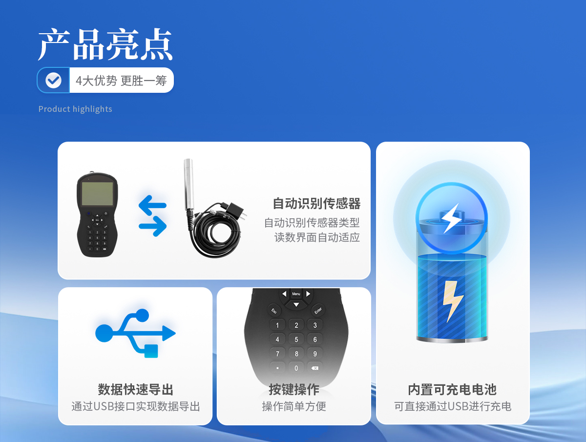 | ? 主機具有IP67防護等級; | ? 3.5寸彩屏顯示,界面菜單設計美觀,操作簡單方便; | ? 人體工程學曲線設計,適于手握握持,帶有橡膠防滑手帶,在潮濕環境中不易滑落; | ? 具有數據存儲功能,且可通過USB接口實現數據導出; | ? 內置可充電電池,且直接通過USB進行充電,無需拆卸電池; | ? 自動識別連接的傳感器類型,讀數界面自動適應; | ? 可對傳感器進行參數設置和校準; |