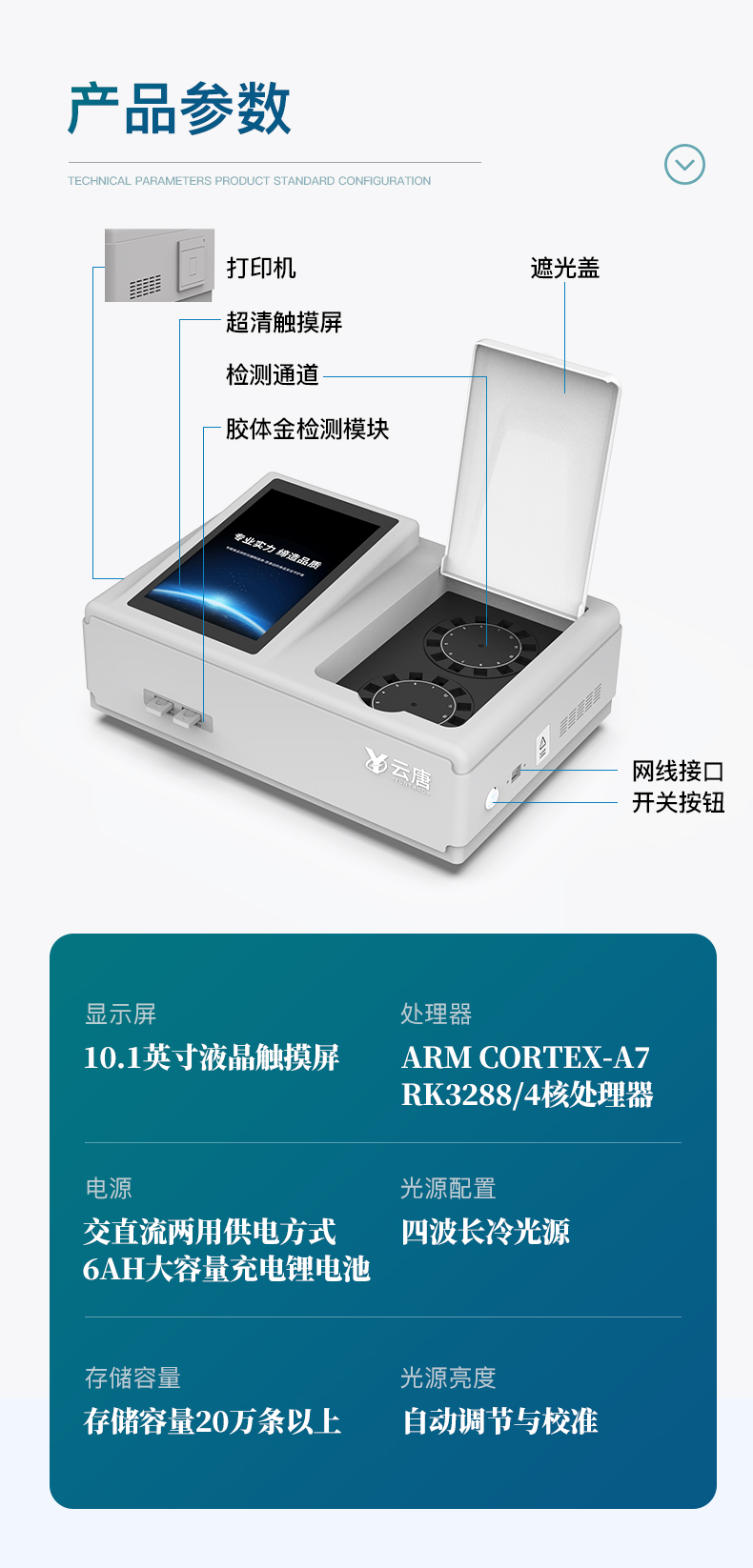 | 儀器采用臺(tái)式一體化系統(tǒng)檢測技術(shù),將分光光度模塊、膠體金檢測模塊、新型農(nóng)殘檢測模塊、數(shù)字化管理模塊、無線通訊模塊高度集成于一體,支持檢測200種食品安全檢測項(xiàng)目,同時(shí)預(yù)留升級檢測方法。 | 儀器檢測模塊標(biāo)準(zhǔn)化、智能化,可隨意自由組合。檢測箱體內(nèi)置多個(gè)標(biāo)準(zhǔn)檢測單元,檢測模塊可以調(diào)整配置。 | 儀器采用全新安卓智能系統(tǒng),主控芯片采用 ARM Cortex-A7,RK3288/4核處理器,10.1寸高清液晶觸摸豎屏,更加**的UI交互界面,運(yùn)轉(zhuǎn)快捷;儀器配備無線通信模塊: 4G(APN)通訊模塊、Wifi模塊,藍(lán)牙傳輸,同時(shí)具有雙USB接口以及RJ45接口能以多種方式實(shí)現(xiàn)數(shù)據(jù)保存和數(shù)據(jù)傳輸功能。 | 創(chuàng)新檢測模式★檢測通道:≥12通道;采用精密旋轉(zhuǎn)比色池設(shè)計(jì),使用同芯片同光源校準(zhǔn)精度,解決不同光源之間的誤差值。1-12通道間誤差0.1%。(***:**202022821055.2) ★儀器具有自動(dòng)識(shí)別比色皿檢測功能,即:將樣品比色皿放入儀器后,點(diǎn)擊樣品檢測,儀器自動(dòng)識(shí)別比色皿進(jìn)行通道檢測。 | 進(jìn)口高精光源:高精度進(jìn)口四波長冷光源,通道配置 410、520、590、630nm 波長光源,一個(gè)光源芯片驅(qū)動(dòng)一個(gè)光源,誤差極小,每臺(tái)設(shè)備單獨(dú)**校準(zhǔn)光源,**比對,同時(shí)參照四種不同波段光源全方位覆蓋市面上99%的農(nóng)殘食品項(xiàng)目檢測。 | 膠體金模塊檢測方式:★采用COMS實(shí)時(shí)成像技術(shù),可采集多個(gè)畫面,支持2個(gè)金標(biāo)同時(shí)讀卡,通過不同顏色的灰度變化,一秒精準(zhǔn)得出結(jié)果。 | 智能操作分析系統(tǒng): | ★便捷操作系統(tǒng):設(shè)備檢測時(shí)可在同一檢測界面自動(dòng)對應(yīng)相關(guān)檢測通道一次性選擇1-12個(gè)樣品名稱,無須退出界面,節(jié)省操作時(shí)間。(需提供對應(yīng)證明) | ★數(shù)據(jù)集成系統(tǒng):設(shè)備首頁自動(dòng)統(tǒng)計(jì)檢測數(shù)據(jù)包含:周檢測數(shù)據(jù)、月檢測數(shù)據(jù),全部檢測總數(shù)量,均包含檢測總數(shù),合格數(shù),不合格數(shù),以及相關(guān)柱形分析圖,對各項(xiàng)檢測數(shù)據(jù)清晰掌握,無需電腦查詢,更加快捷直觀。(需提供對應(yīng)證明文件) | ★項(xiàng)目預(yù)設(shè)系統(tǒng):支持添加單個(gè)及多個(gè)相同或不相同的任務(wù)預(yù)設(shè),一鍵快速調(diào)取,每一個(gè)任務(wù)分別可以設(shè)置不同的樣品、批次、編號、來源、備注、抽樣信息、檢測信息、受檢信息、復(fù)核信息等更多信息。無縫鏈接平臺(tái)和APP實(shí)時(shí)查看下發(fā)任務(wù)。(需提供對應(yīng)證明文件) | ★數(shù)據(jù)監(jiān)管系統(tǒng):同步對接監(jiān)管平臺(tái),數(shù)據(jù)可局域網(wǎng)和互聯(lián)網(wǎng)數(shù)據(jù)上傳,檢測結(jié)果可選擇直接傳至食品安全監(jiān)管平臺(tái)。集成OSS輸出存儲(chǔ)服務(wù)、區(qū)分設(shè)備定向管理應(yīng)用,進(jìn)行區(qū)域食品安全監(jiān)管及大數(shù)據(jù)分析處理與數(shù)據(jù)統(tǒng)計(jì),檢測區(qū)域食品安全長短期動(dòng)態(tài),達(dá)到食品安全問題預(yù)估、預(yù)警。(需提供對應(yīng)食品理化分析系統(tǒng)計(jì)算機(jī)軟件著作權(quán))。 | ★ 自定義打印系統(tǒng):內(nèi)置全新打印系統(tǒng),新創(chuàng)自定義打印方式,可按需靈活設(shè)置開啟或關(guān)閉:產(chǎn)品合格證(國家農(nóng)業(yè)部標(biāo)準(zhǔn)要求),二維碼,抽樣信息、檢測信息,受檢信息、復(fù)核信息、抽樣日期、檢測日期等信息的打印。(需提供對應(yīng)證明) | ★系統(tǒng)遠(yuǎn)程更新功能:可定向分客戶分儀器更新系統(tǒng),按照不同客戶后期實(shí)際需求添加項(xiàng)目,無需機(jī)器返廠,即可遠(yuǎn)程實(shí)時(shí)升級全新系統(tǒng),節(jié)省時(shí)間成本及避免運(yùn)輸造成設(shè)備損壞。 | 儀器主機(jī)采用一體化防水、抗壓、防撞擊、防腐蝕箱體設(shè)計(jì),同時(shí)配備交直流供電,可連接車載電源,可選配大容量充電鋰電池,滿足現(xiàn)場野外檢測需求。 | 安全證書,放心保障:儀器具有中國計(jì)量科學(xué)研究院校準(zhǔn)證書,權(quán)威認(rèn)證。 |