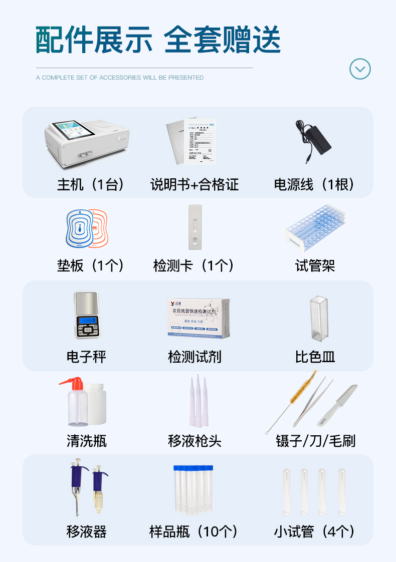 | 食品添加劑:二氧化硫、雙氧水、亞硝酸鹽、硝酸鹽、苯甲酸鈉、山梨酸鉀、糖精鈉、甜蜜素、木耳硫酸鎂等 | 有毒有害物質(zhì):甲醛、吊白塊、硼砂、過氧化苯甲酰、溴酸鉀、羅丹明B、三聚氰胺、蘇丹紅、工業(yè)堿、尿素、明礬等 | 果蔬:農(nóng)藥殘留(酶抑制率法) | 病害肉:組胺、揮發(fā)性鹽基氮 | 重金屬含量:鉛、鎘、鉻、汞、砷、錫、鎳、鋁等 | 水酒飲品分析:酒中甲醇、乙醇、乳品及牛奶中蛋白質(zhì) | 調(diào)味品成分: 食醋的總酸、醬油的總酸、芝麻油純度、谷氨酸鈉、醬油氨基酸態(tài)氮、食鹽中亞鐵氰化鉀、食鹽中碘等 | 食用色素類:紅色色素(胭脂紅、莧菜紅、莧菜紅)、黃色色素(檸檬黃、日落黃)、藍(lán)色色素(亮藍(lán))等 | 蜂蜜成分:果糖和葡萄糖、蔗糖、淀粉酶、酸度等 | 食用油脂:過氧化值、酸價(jià)等 |