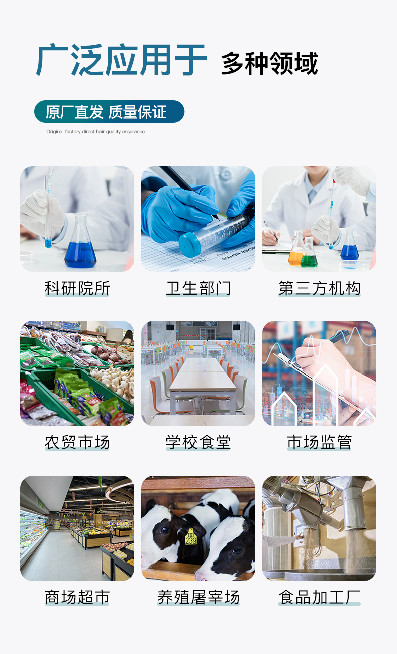 目前廣泛應(yīng)用于市場監(jiān)管局、檢測中心、衛(wèi)生監(jiān)督部門、農(nóng)業(yè)部門、院校及各單位食堂、、商超市場、司法部門、餐飲機構(gòu)、檢驗檢疫部門等單位使用。