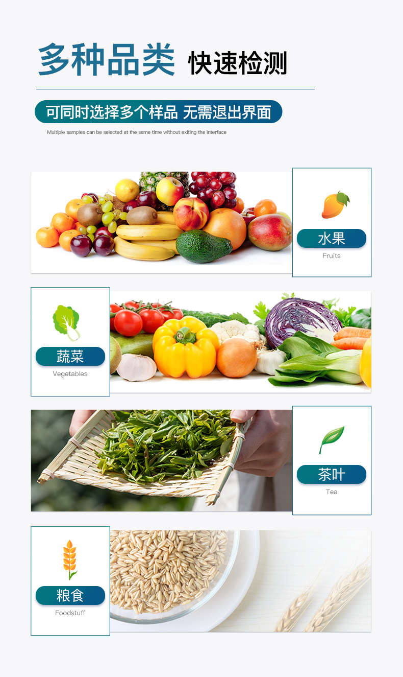 | 1)儀器采用臺式一體化系統(tǒng)檢測技術(shù),新型農(nóng)殘檢測模塊、數(shù)字化管理模塊、無線通訊模塊高度集成于一體,同時預(yù)留升級檢測方法。 | 2)儀器檢測模塊標準化、智能化,可隨意自由組合。檢測箱體內(nèi)置多個標準檢測單元,檢測模塊可以調(diào)整配置。 | 3)儀器采用全新安卓智能系統(tǒng),主控芯片采用 ARM Cortex-A7,RK3288/4核處理器,10.1寸高清液晶觸摸豎屏,更加**的UI交互界面,運轉(zhuǎn)快捷;儀器配備無線通信模塊: 4G(APN)通訊模塊、Wifi模塊,藍牙傳輸,同時具有雙USB接口以及RJ45接口能以多種方式實現(xiàn)數(shù)據(jù)保存和數(shù)據(jù)傳輸功能。 | 4)創(chuàng)新檢測模式:檢測通道:≥24通道;采用精密旋轉(zhuǎn)比色池設(shè)計,使用同芯片同光源校準精度,解決不同光源之間的誤差值。1-12通道間誤差0.1%。(***:**202022821055.2) 儀器具有自動識別比色皿檢測功能,即:將樣品比色皿放入儀器后,點擊樣品檢測,儀器自動識別比色皿進行通道檢測。 | 5)進口高精光源:高精度進口四波長冷光源,通道配置 410、520、590、630nm 波長光源,一個光源芯片驅(qū)動一個光源,誤差極小,每臺設(shè)備單獨**校準光源,**比對,同時參照四種不同波段光源全方位覆蓋市面上99%的農(nóng)殘食品項目檢測,可按照實際需求進行食品項目檢測升級。 | 6)智能操作分析系統(tǒng): | 6.1.便捷操作系統(tǒng):設(shè)備檢測時可在同一檢測界面自動對應(yīng)相關(guān)檢測通道一次性選擇1-24個樣品名稱,無須退出界面,節(jié)省操作時間。 | 6.2.數(shù)據(jù)集成系統(tǒng):設(shè)備首頁自動統(tǒng)計檢測數(shù)據(jù)包含:周檢測數(shù)據(jù)、月檢測數(shù)據(jù),全部檢測總數(shù)量,均包含檢測總數(shù),合格數(shù),不合格數(shù),以及相關(guān)柱形分析圖,對各項檢測數(shù)據(jù)清晰掌握,無需電腦查詢,更加快捷直觀。 | 6.3.項目預(yù)設(shè)系統(tǒng):支持添加單個及多個相同或不相同的任務(wù)預(yù)設(shè),一鍵快速調(diào)取,每一個任務(wù)分別可以設(shè)置不同的樣品、批次、編號、來源、備注、抽樣信息、檢測信息、受檢信息、復(fù)核信息等更多信息。 | 6.4.數(shù)據(jù)監(jiān)管系統(tǒng):同步對接監(jiān)管平臺,數(shù)據(jù)可局域網(wǎng)和互聯(lián)網(wǎng)數(shù)據(jù)上傳,檢測結(jié)果可選擇直接傳至食品安全監(jiān)管平臺。集成OSS輸出存儲服務(wù)、區(qū)分設(shè)備定向管理應(yīng)用,進行區(qū)域食品安全監(jiān)管及大數(shù)據(jù)分析處理與數(shù)據(jù)統(tǒng)計,檢測區(qū)域食品安全長短期動態(tài),達到食品安全問題預(yù)估、預(yù)警。 | 6.5.自定義打印系統(tǒng):內(nèi)置新創(chuàng)自定義打印系統(tǒng),可按需靈活設(shè)置開啟或關(guān)閉:產(chǎn)品合格證(國家農(nóng)業(yè)部標準),二維碼,抽樣信息、檢測信息,受檢信息、復(fù)核信息、抽樣日期、檢測日期等信息的打印。 | 6.6.A4版本報告打印功能:設(shè)備可自動生成A4版報告,外接打印機即可打印 | 6.7.系統(tǒng)遠程更新功能:可定向分客戶分儀器更新系統(tǒng),按照不同客戶后期實際需求添加項目,無需設(shè)備返廠,即可遠程實時升級全新系統(tǒng),節(jié)省時間成本及避免運輸造成設(shè)備損壞。 | 7)安全證書,放心保障:儀器具有中國計量科學(xué)研究院校準證書,權(quán)威認證。 |