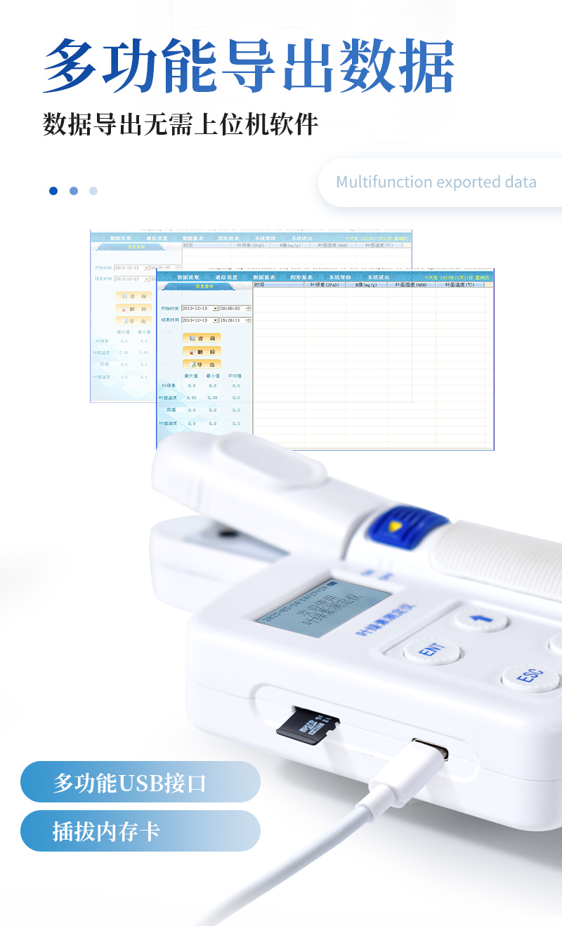 | 數(shù)據(jù)測量:**的測量精度和重復(fù)性(精度:± 1.0 SPAD,重復(fù)性:±0.3 SPAD) ,媲美進口品牌,或可根據(jù)已知葉綠素含量的葉片或標準試樣客戶自行校準 | 數(shù)據(jù)分組:儀器可將數(shù)據(jù)自動分組,并可自動計算每組數(shù)據(jù)的平均值。可將同一葉片測量的數(shù)據(jù)自動分為一組,便于查看每次測量數(shù)據(jù)及這一組數(shù)據(jù)的平均值,有效的避免了不同葉片的測量數(shù)據(jù)混淆。采用16GB超大存儲,所以分組數(shù)量和每組的數(shù)據(jù)不受限制 | 數(shù)據(jù)存儲: 16GB超大存儲空間,數(shù)據(jù)存儲量巨大 | 數(shù)據(jù)瀏覽:可在儀器上隨時瀏覽測量的數(shù)據(jù)、每組數(shù)據(jù)的平均值和刪除異常數(shù)值。數(shù)據(jù)情況更加直觀 | 數(shù)據(jù)導(dǎo)出:多功能USB接口,可實現(xiàn)數(shù)據(jù)導(dǎo)出與充電功能,可將儀器與電腦直接聯(lián)機,數(shù)據(jù)以EXCEL格式導(dǎo)出,無需上位機軟件,操作簡單方便 | 顯示:高對比度LCD顯示屏,強光下也可清晰顯示數(shù)據(jù) | 測量迅速、簡便:測量時只需要將葉片插入并合上測量探頭即可,不需要采摘葉片,不影響作物正常生長,可以在作物的生長過程中全程對特定的葉片進行監(jiān)測,從而得到更科學(xué)的分析結(jié)果 | 電池消耗:低功耗模式設(shè)計,內(nèi)置大容量鋰離子充電電池,節(jié)能環(huán)保并方便進行戶外操作 | 儀器充電:**的充電管理設(shè)計,可適配多數(shù)的USB口(5V)充電器,具有防過充功能 | 易攜帶:250g的重量,方便攜帶到田間進行活體測量 |