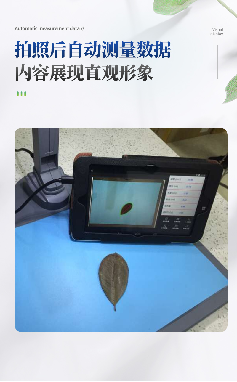 智能拍照式葉面積測量系統由圖像采集儀和裝入自主開發軟件的平板組成,采用本公司多年積累的面積測量算法,根據葉片輪廓特征提取、圖形實物轉換、邊緣檢測等技術,能夠形象并快速得到所測葉片面積、周長、蟲洞數量等參數。相比傳統的葉面積,具有測量更快速簡便、結果更形象客觀、數據多樣并大大減少了人為操作帶來的誤差。