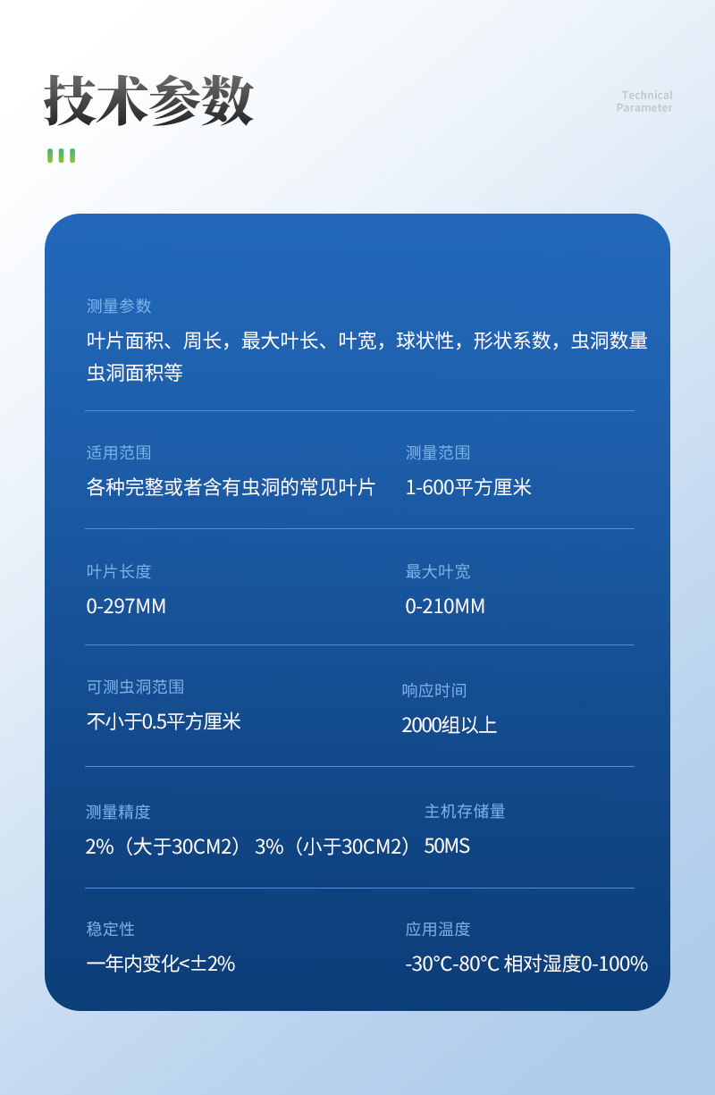 | 測量參數:葉片面積、周長,**葉長、葉寬,球狀性,形狀系數,蟲洞數量,蟲洞面積等 | 適用范圍:各種完整或者含有蟲洞的常見葉片 | 測量范圍:1-600平方厘米 | 葉片長度:0-297mm | **葉寬:0-210mm | 可測蟲洞范圍:不小于0.5平方厘米 | 測量精度:2%(大于30cm2),3%(小于30cm2) | 主機存儲量:2000組以上 | 穩定性:一年內變化<±2% | 響應時間:50ms | 應用溫度:-30℃-80℃;相對濕度0-100% |