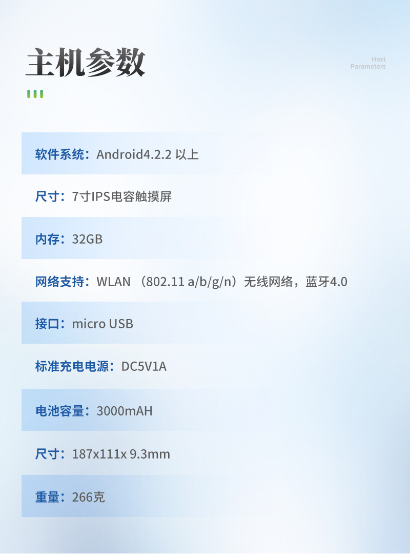 | 軟件系統:Android4.2.2 以上 | 尺寸:7寸IPS電容觸摸屏 | 內存:32GB | 網絡支持:WLAN (802.11 a/b/g/n)無線網絡,藍牙4.0 | 接口:micro USB | 標準充電電源:DC5V1A | 電池容量:3000mAH | 尺寸:187x111x 9.3mm 重量:266克 |