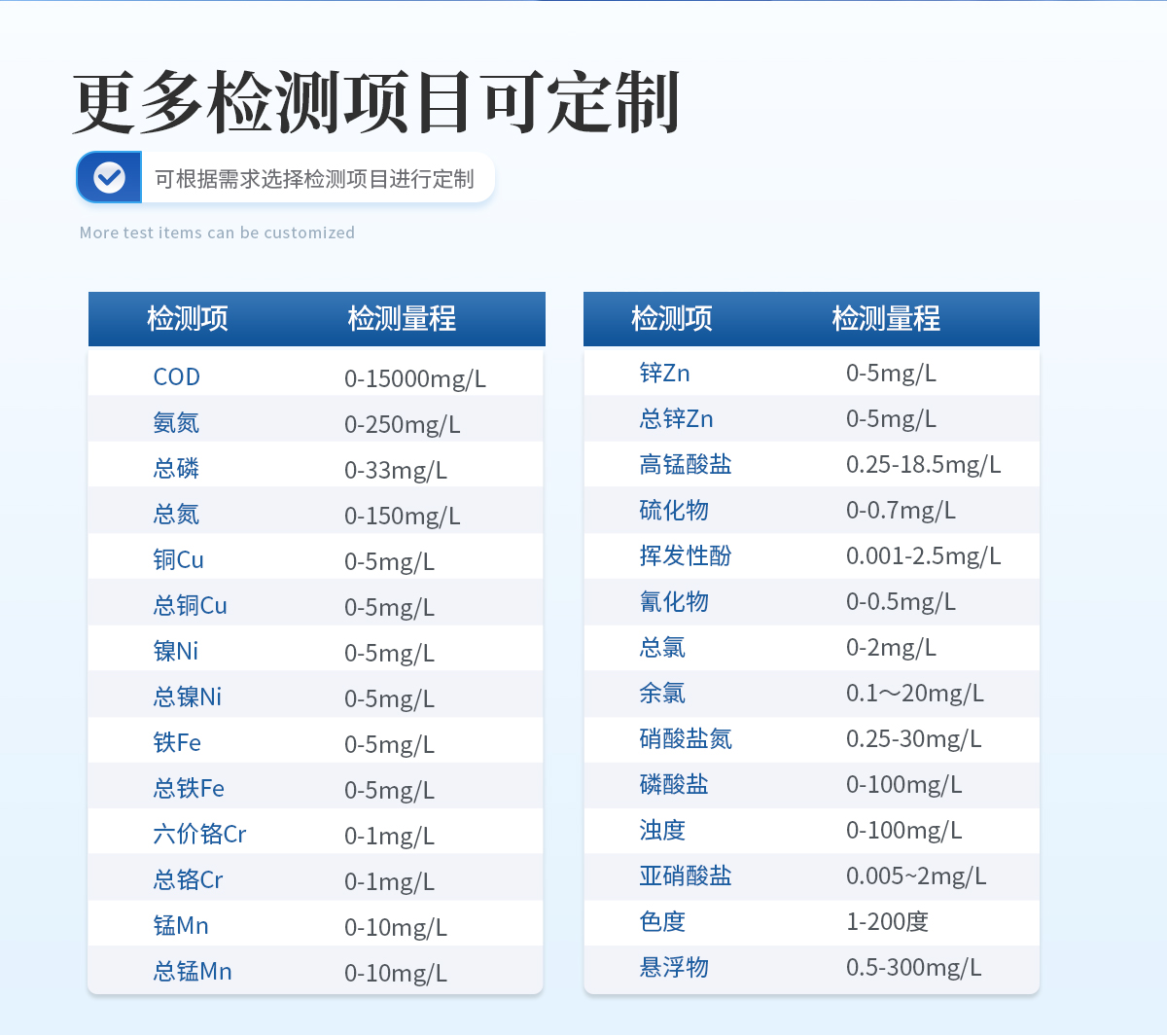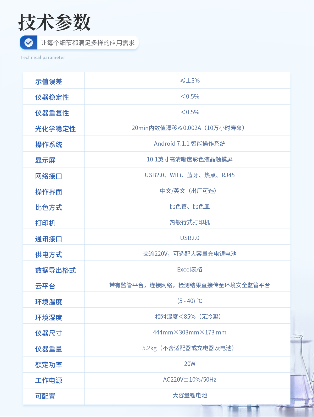 示值誤差:≤±5%; 儀器穩(wěn)定性:<0.5%; 儀器重復(fù)性:<0.5%; 光化學(xué)穩(wěn)定性:20min內(nèi)數(shù)值漂移≤0.002A(10萬小時壽命); 檢測量程:0.004-0.05mg/L; 檢測下限:0.004mg/L; 分辨率:0.001mg/L; 比色方式:支持10mm、30mm、40mm、50mm皿比色和φ16mm管比色等比色方式 操作系統(tǒng):Android7.1.1智能操作系統(tǒng); 操作界面:中文或英文操作界面; 顯示屏:10.1英寸高清晰度彩色液晶觸摸屏; 網(wǎng)絡(luò)接口:USB2.0、HDMI、WiFi、藍(lán)牙、熱點、RJ45; 云平臺:儀器帶有監(jiān)管平臺,連接有線/無線網(wǎng)絡(luò),檢測結(jié)果直接傳輸至環(huán)境安全監(jiān)管平臺; 打印機(jī):熱敏行式打印機(jī); 數(shù)據(jù)儲存:800萬組,可自由調(diào)用查看; 數(shù)據(jù)導(dǎo)出格式:Excel表格; 儀器尺寸:367x243x125mm; 儀器重量:5.3kg; 環(huán)境溫度:(5-40)℃; 環(huán)境濕度:相對濕度<85%(無冷凝); 額定功率:10W; 工作電源:AC220V±10%/50Hz; 可配置:大容量鋰電池。