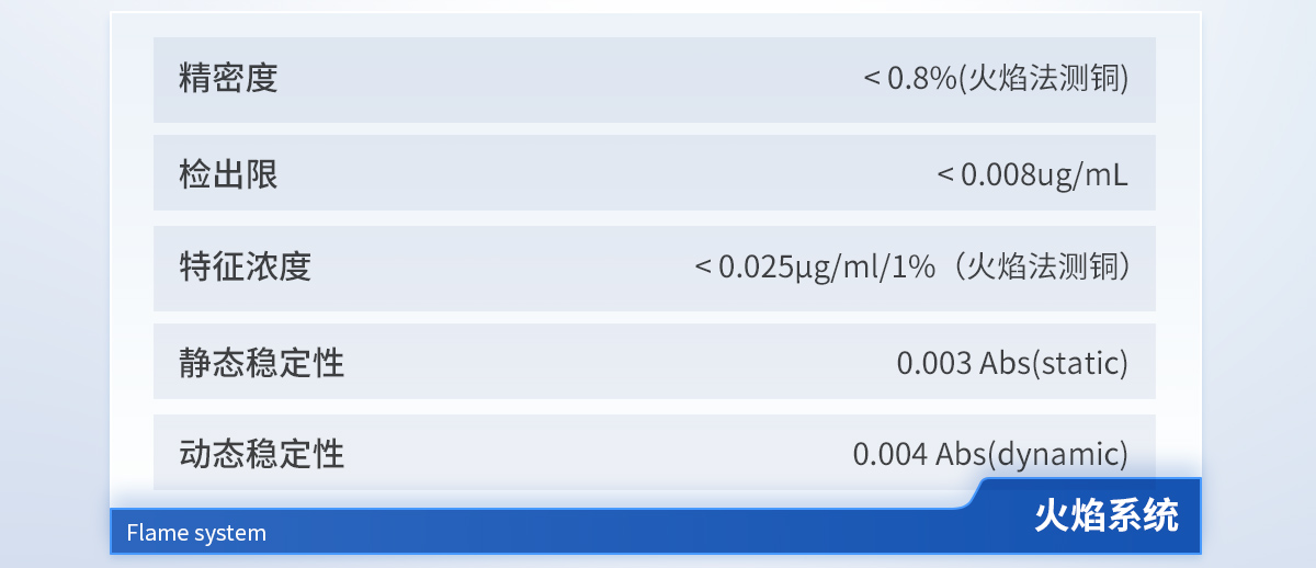 | 整機單色器類型:切爾尼-特納型(Czerny-Turner) | 波長范圍:190nm~900nm | 波長準確度:±0.25nm | 波長重復性:< 0.05nm | 光譜帶寬:0.1/0.2/0.4/0.7/1.4 nm 五檔自動切換 | 火焰系統 | 精密度:< 0.8%(火焰法測銅) | 檢出限:< 0.008ug/mL | 特征濃度:< 0.025μg/ml/1%(火焰法測銅) | 靜態穩定性: 0.003 Abs(static) | 動態穩定性: 0.004 Abs(dynamic) | 石墨爐系統 | 石墨爐控溫范圍:室溫--3000℃ | 石墨爐升溫速率:3000℃/s | 石墨爐測鎘(Cd)精密度:≤ 2% | 石墨爐測鎘(Cd)精密度:≤ 5% | 石墨爐測鎘(Cd)特征量:≤ 0.5pg | 石墨爐測鎘(Cd)檢出限:≤ 1pg | 石墨爐測鎘(Cd)檢出限:≤ 2pg | 電源:220V±22V,50Hz±1Hz,5kW(峰值) |