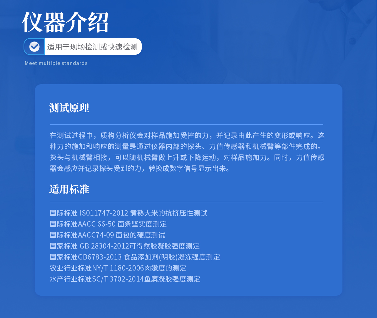 | 國際標準 IS011747-2012 煮熟大米的抗擠壓性測試 | 國際標準AACC 66-50 面條堅實度測定 | 國際標準AACC74-09 面包的硬度測試 | **** GB 28304-2012可得然膠凝膠強度測定 | ****GB6783-2013 食品添加劑(明膠)凝凍強度測定 | 農(nóng)業(yè)行業(yè)標準NY/T 1180-2006肉嫩度的測定 | 水產(chǎn)行業(yè)標準SC/T 3702-2014魚糜凝膠強度測定 |