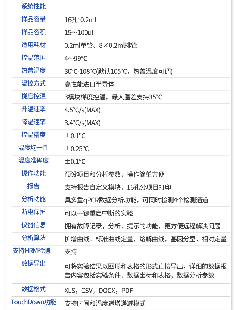 | 基本性能 | 外形尺寸:270*352*195 (mm) | 重量:7.1kg | 電源:220V | 功率:**工作功率300w | 操作系統:自帶Android操作系統 | 外接電腦:外接windows電腦(win7系統以上) | 系統語言:中英文實時切換 | 通信接口:方形USB | 操作環境參數 | 操作環境溫度:18~35℃ | 操作環境相對濕度:0%~85% | 運輸及儲存溫度:-20~55℃ | 運輸及儲存相對濕度:0%~85% | 系統性能 | 樣品容量:16孔*0.2ml | 樣品容積:15~100ul | 適用耗材:0.2ml單管、8×0.2ml排管 | 控溫范圍:4~99℃ | 熱蓋溫度:30℃-108℃(默認105℃,熱蓋溫度可調) | 溫控方式:高性能進口半導體 | 梯度控溫:3模塊梯度控溫,**溫差支持35℃ | 升溫速率:4.5℃/s(MAX) | 降溫速率:3.4℃/s(MAX) | 控溫精度:±0.1℃ | 溫度均一性:±0.25℃ | 溫度準確度:±0.1℃ | 操作功能:預設項目和分析參數,操作簡單方便 | 報告:支持報告自定義模塊,16孔分項目打印 | 分析功能:具多重qPCR數據分析功能,可同時檢測4個檢測通道 | 斷電保護:可以一鍵重啟中斷的實驗 | 儀器信息:擁有故障記錄,分析,提示的功能,更方便遠程解決問題 | 分析算法:擴增曲線,標準曲線定量、熔解曲線,基因分型(SNP),相對定量 | 支持HRM檢測:支持 | 數據導出:可將實驗結果以圖形和表格的形式直接導出;詳細的數據報告內容包括實驗條件,數據坐標和表格,數據分析參數。 | 數據格式:XLS, CSV, DOCX,PDF | TouchDown功能:支持時間和溫度遞增遞減模式 | 熒光檢測系統性能 | 檢測靈敏度:可檢測單拷貝基因 | 動態范圍:1~10^10 | 熒光重復性:CV<1%(使用某品牌試劑做16孔均一性實驗,16個孔的ct差值保持在0.5以內,cv保持在1%以內。)> | 相關系數:0.99~1(每種濃度3個重復,梯度曲線的相關系數>0.99,擴增效率保持在99%~101%之間) | 擴增效率:99%~101% | 可信度:區分1000與2000拷貝濃度差異 | 激光光源:大功率LED(免維護,壽命長) | 檢測器:高靈敏度光電傳感器 | 激發和檢測傳播介質:耐高溫專業導光光纖 | 激發光波長:460nm~480nm , 525nm~545nm, 575nm~595nm ,600nm~620nm | 檢測光波長:505nm~525nm , 555nm~575nm , 600nm~620nm , 660nm~680nm |